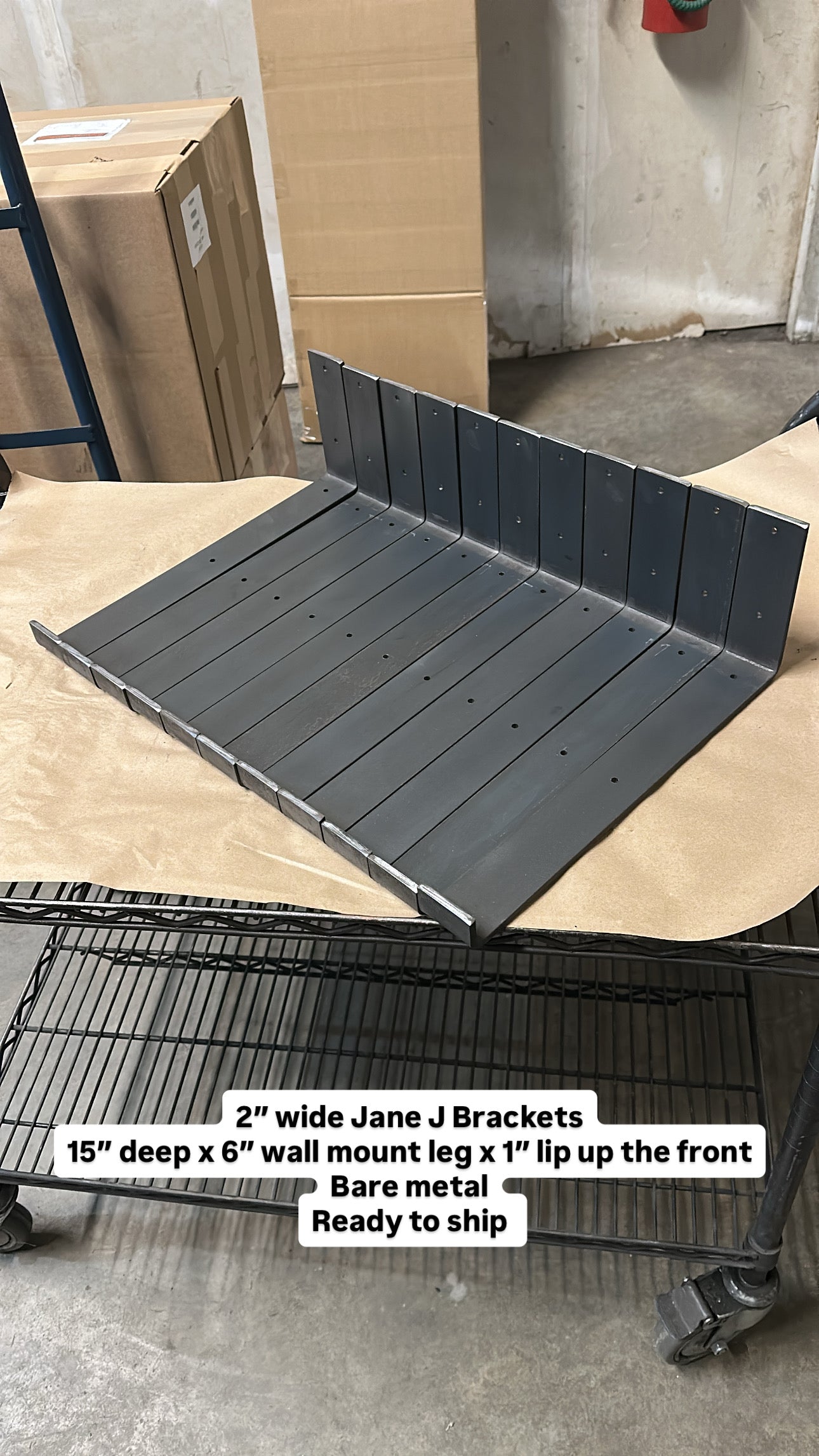 (10) 2 inch wide J Brackets. Bare metal. 15” deep x 6” wall mount leg x 1” lip up the front