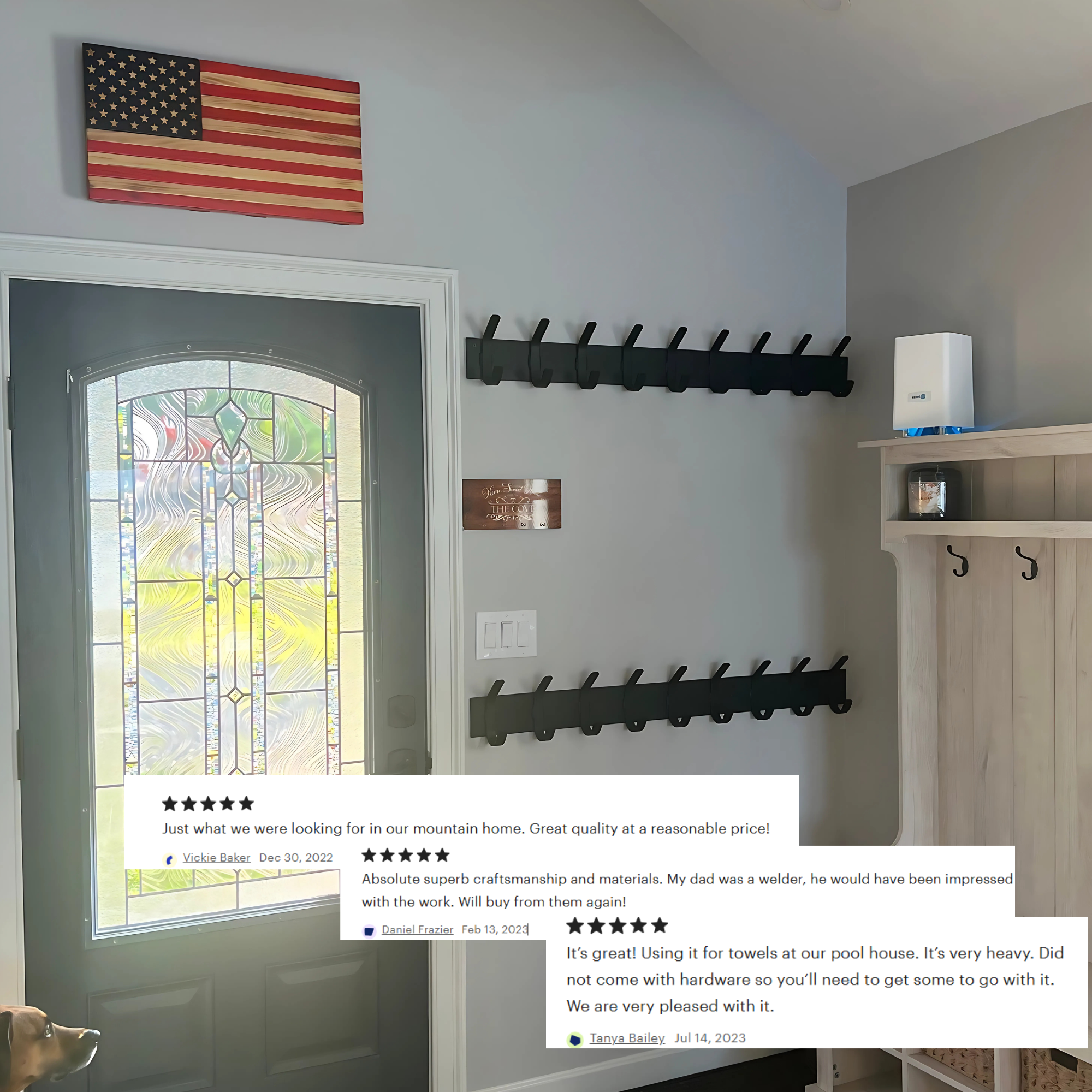 Introducing The Industrial Farm Co Riseform Heavy-Duty Steel Coat Rack - a stylish and functional accessory for any home or office. Crafted with meticulous attention to detail, this coat rack features a 4-inch wide backplate and 1-inch wide hooks that are expertly welded to provide reliable support for your coats, hats, and other accessories.