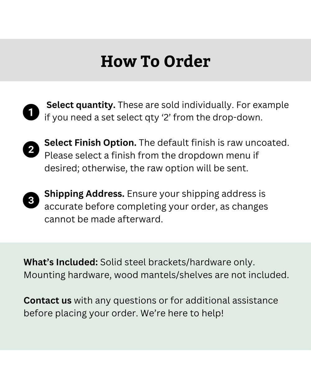 Raw uncoated: reveals the steel’s natural luster, unprotected from rust. Recommended for those seeking a weathered, rusted finish or for those who plan to paint/coat the bracket themselves.