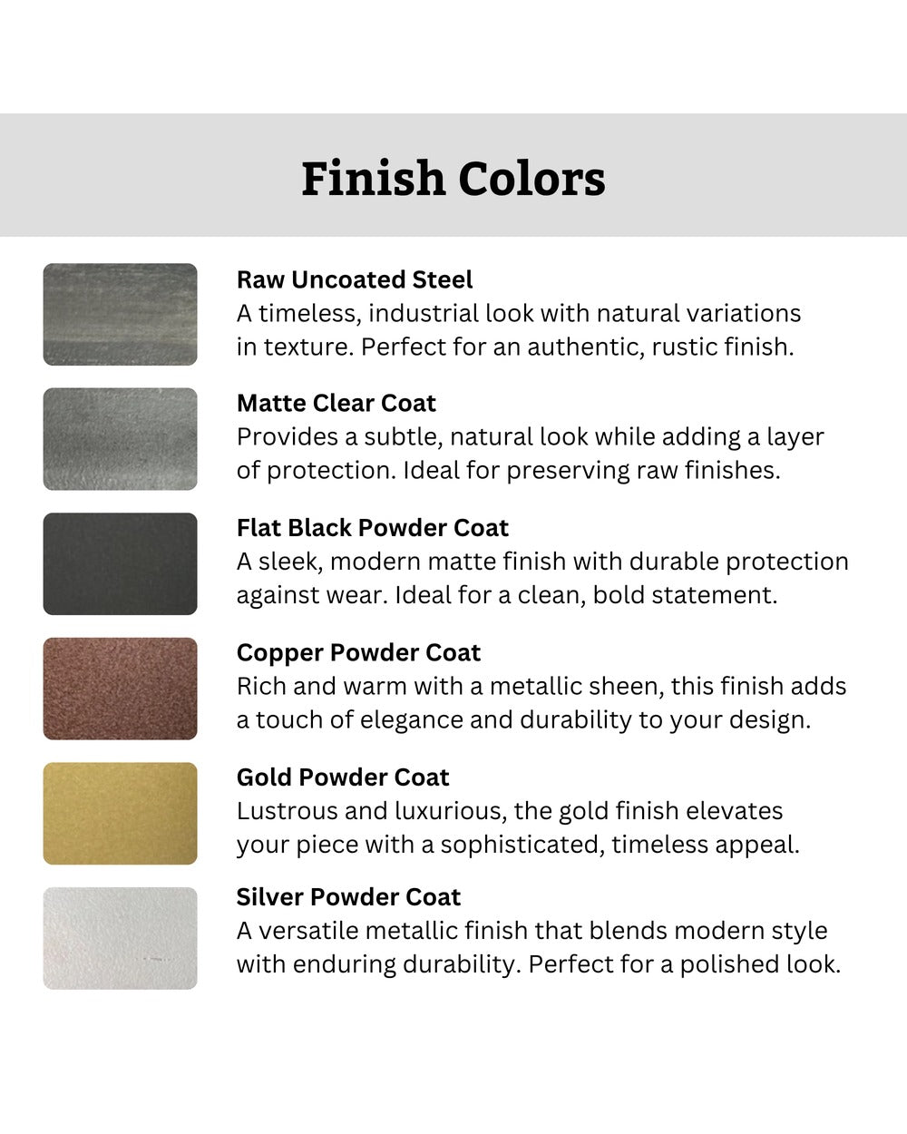 Powder coat: creates a smooth, sealed finish in the desired color and offers extra rust