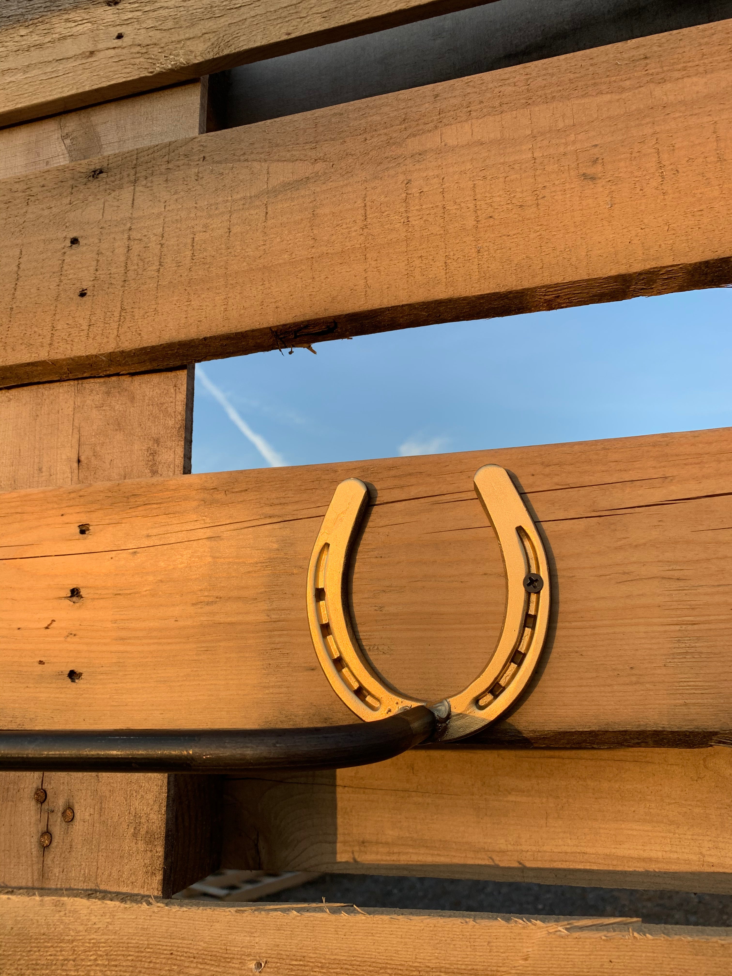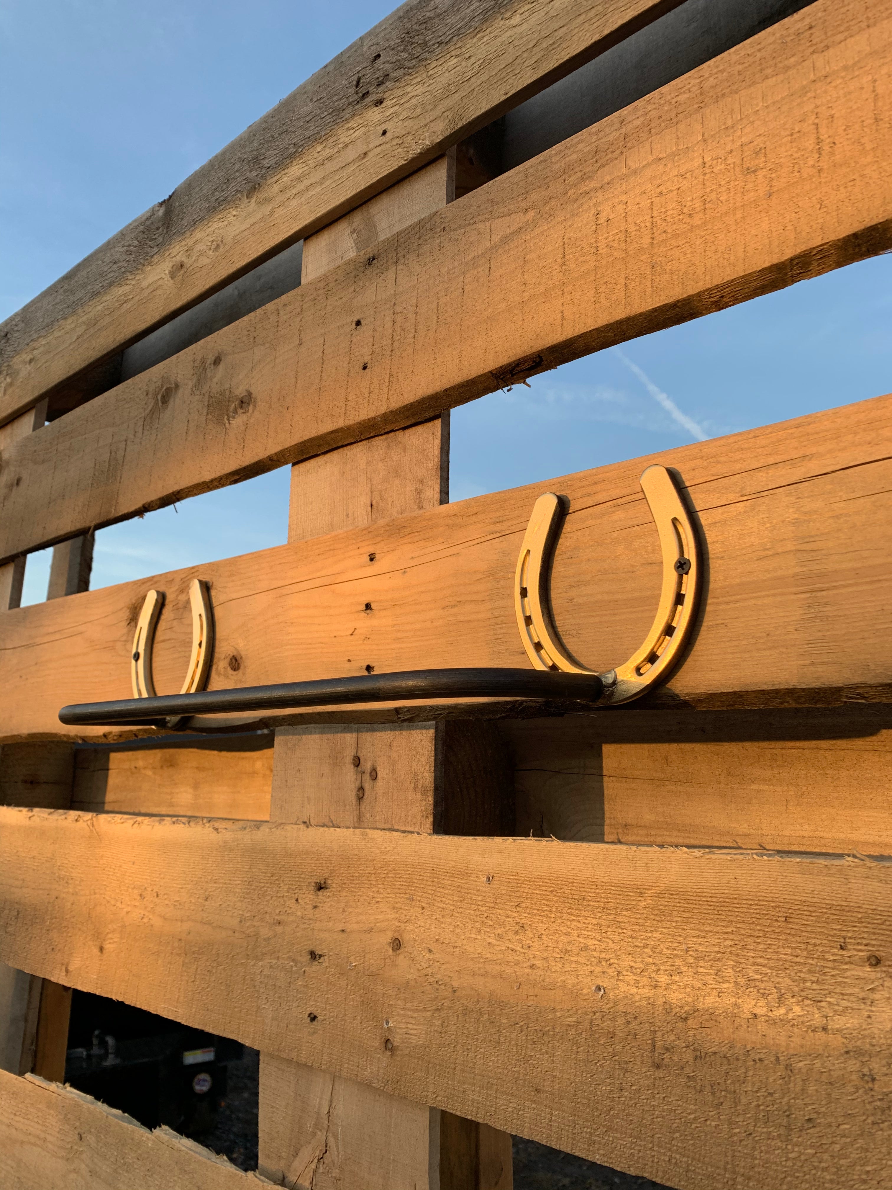 The Donahue — a horseshoe-mounted blanket and towel bar for your barn, bathroom, or western-styled space. Authentic horseshoe end caps with a solid steel round bar create the perfect blend of equestrian charm and everyday function. Handmade in Central NY by a family shop with 53,000+ sales and 8,000+ five-star reviews.