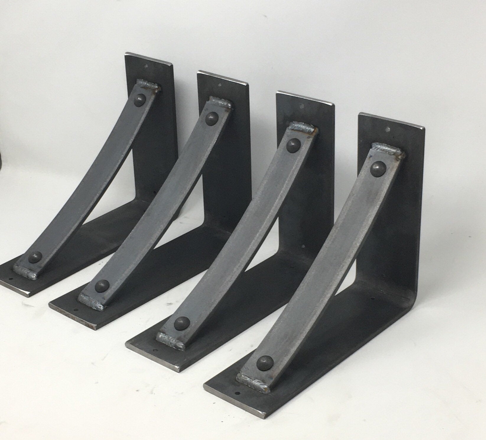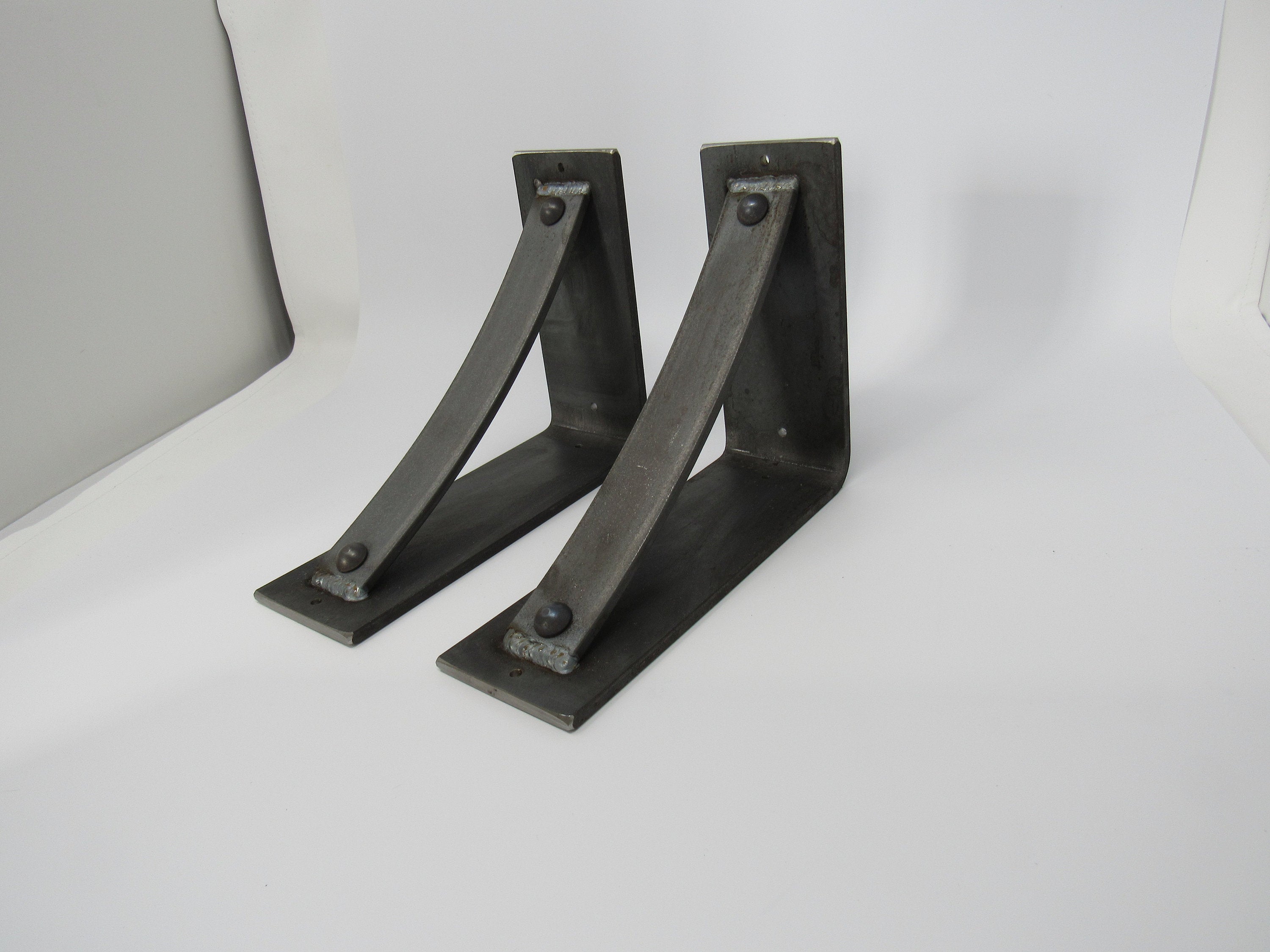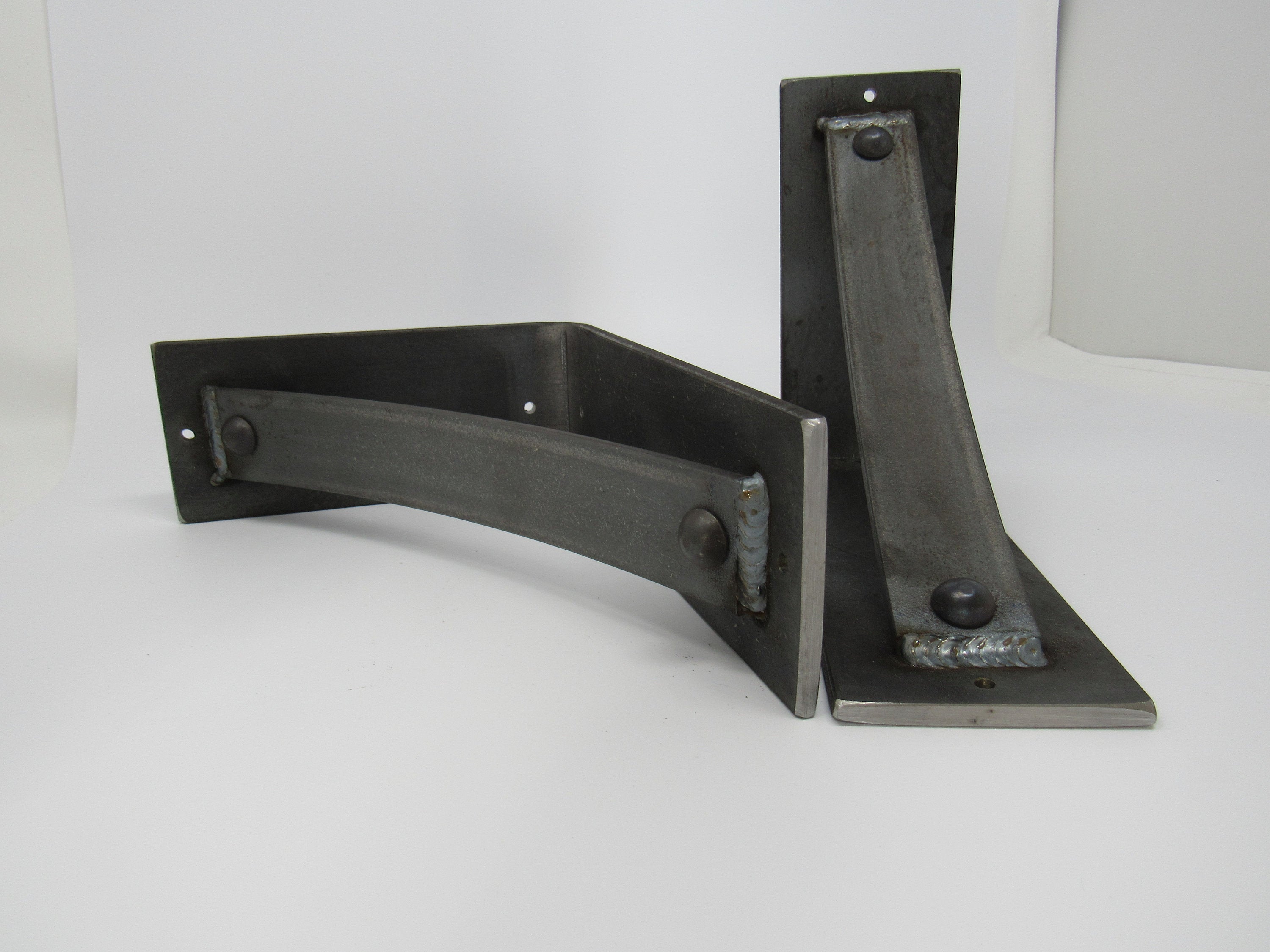 The Industrial Farm Co Troy Supports are a traditional "L" shaped bracket updated with a slightly curved support bar and decorative rivets. This design is 3 inches wide with a 1.5 inch curved support featuring rivets welded in at each end.