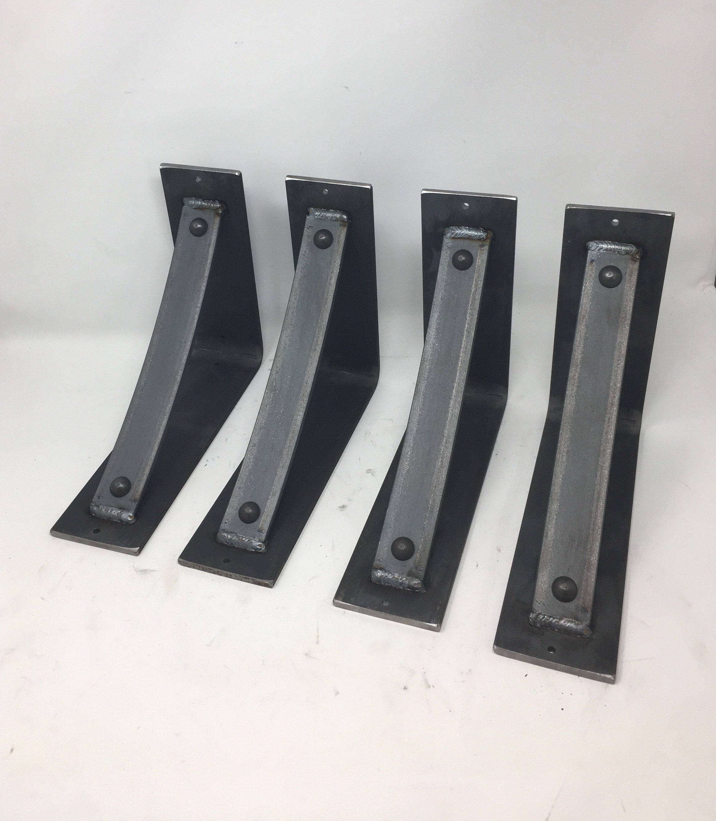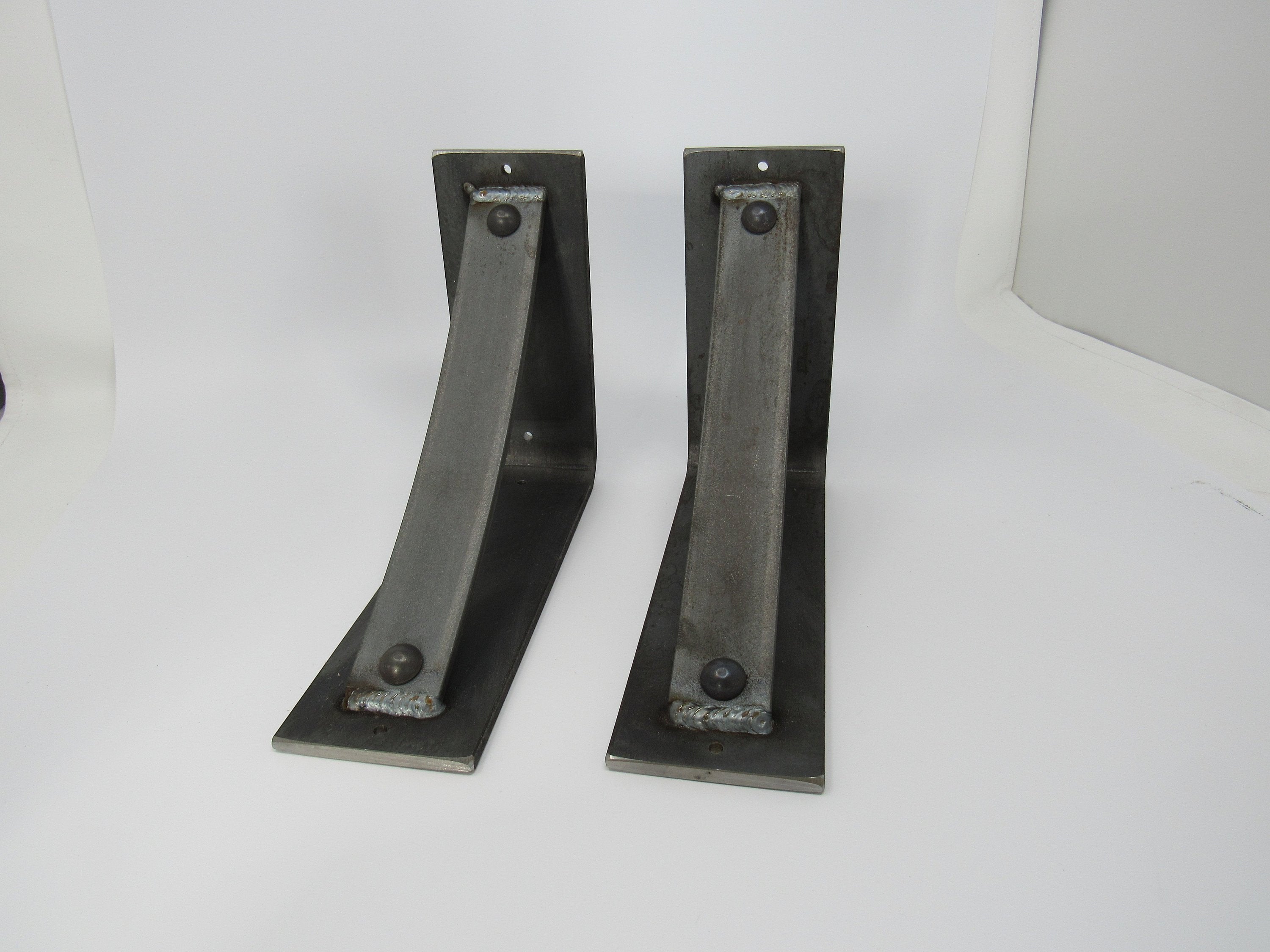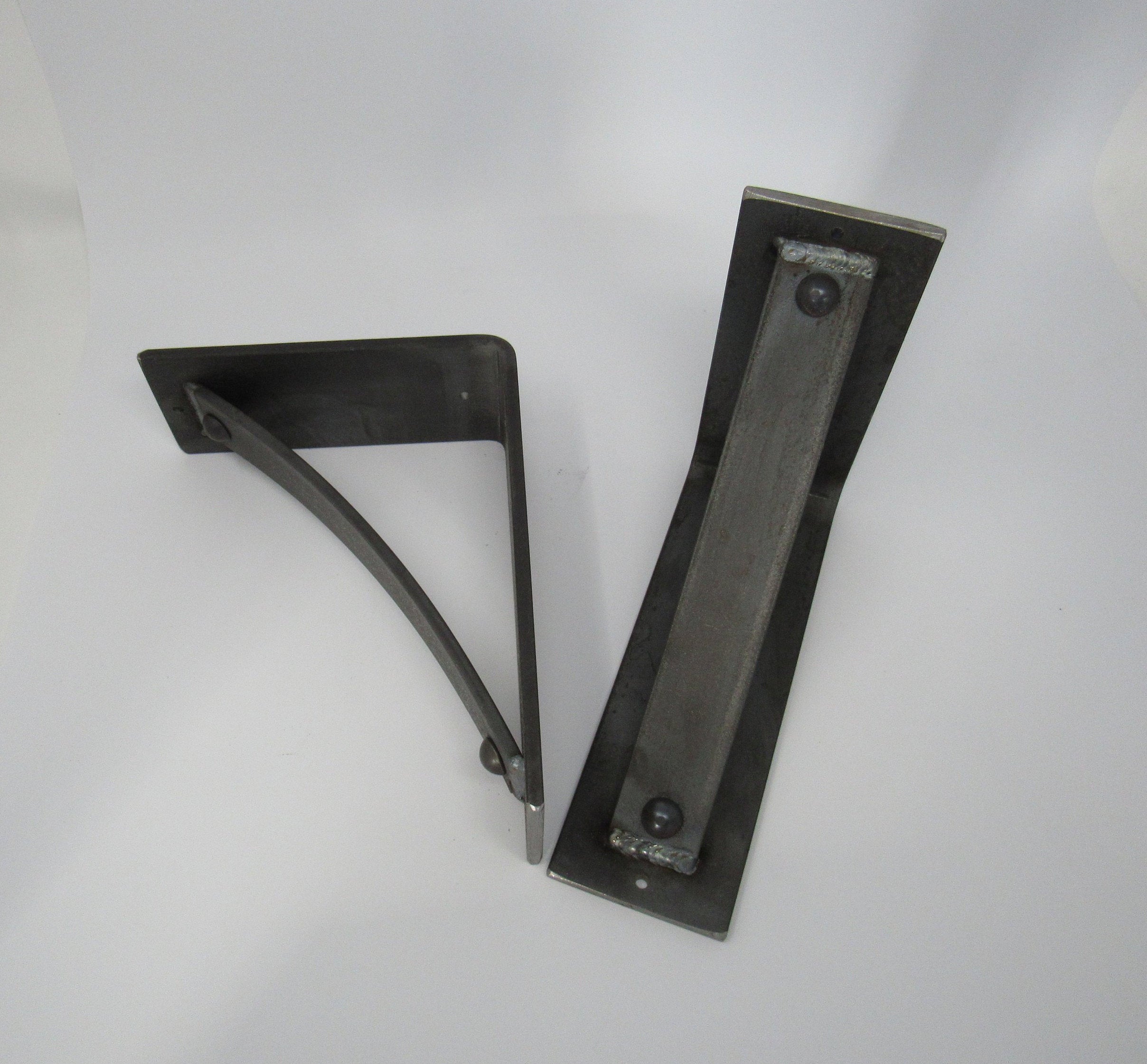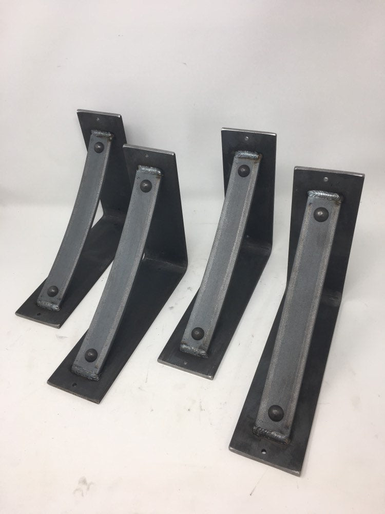 The Industrial Farm Co Troy Supports are a traditional "L" shaped bracket updated with a slightly curved support bar and decorative rivets. This design is 3 inches wide with a 1.5 inch curved support featuring rivets welded in at each end.